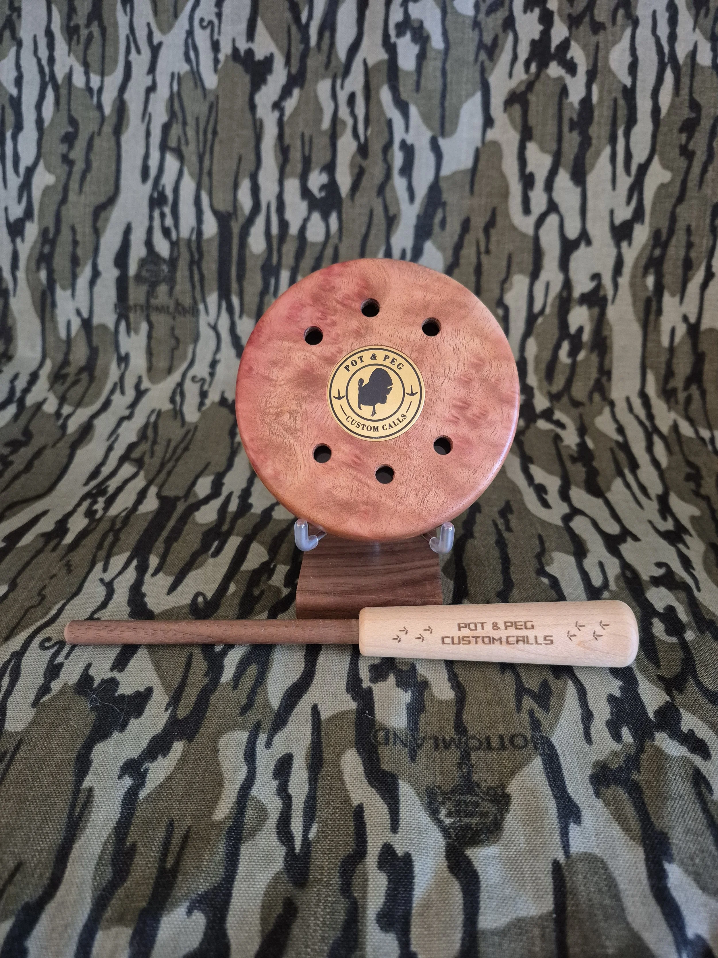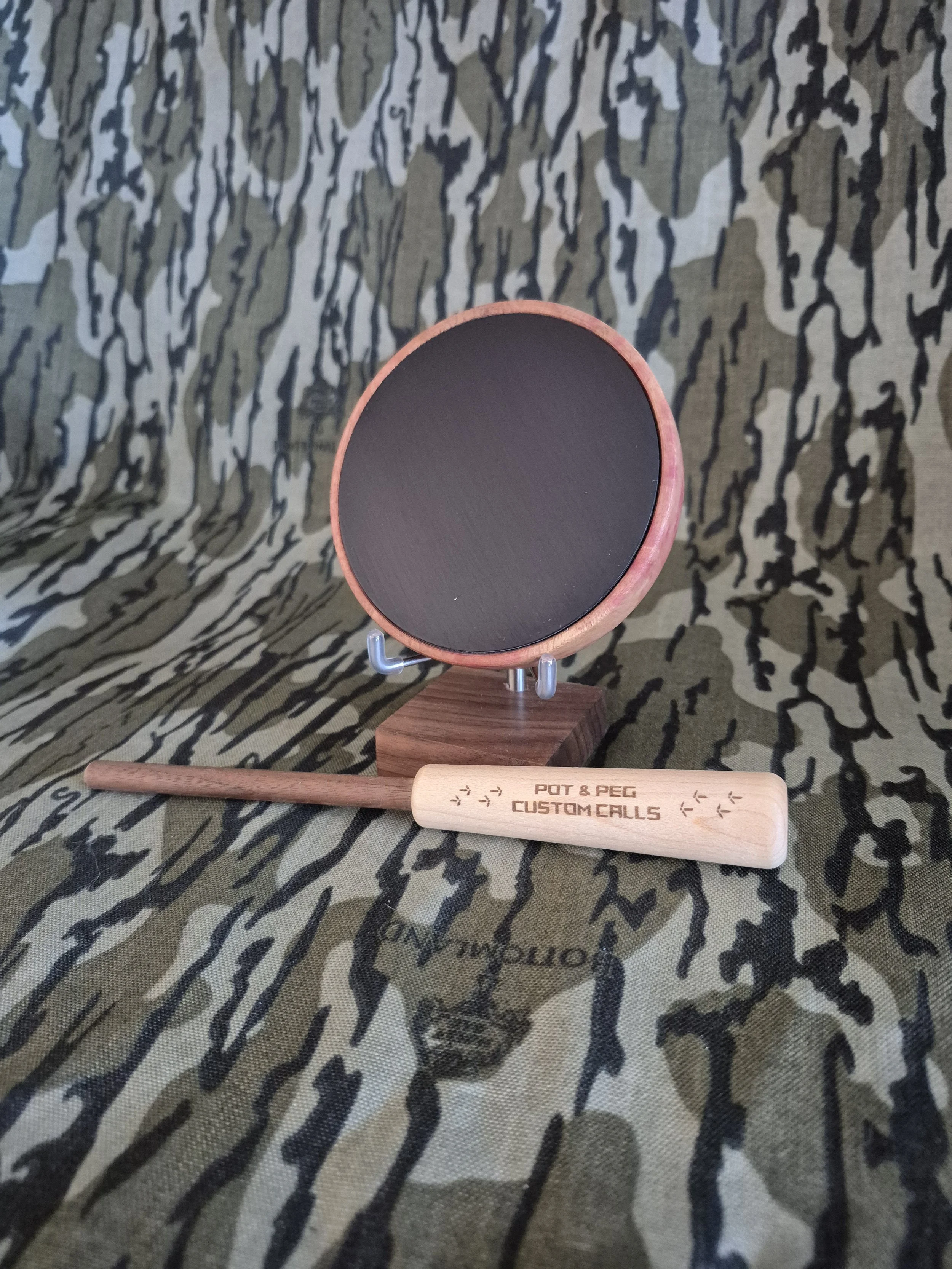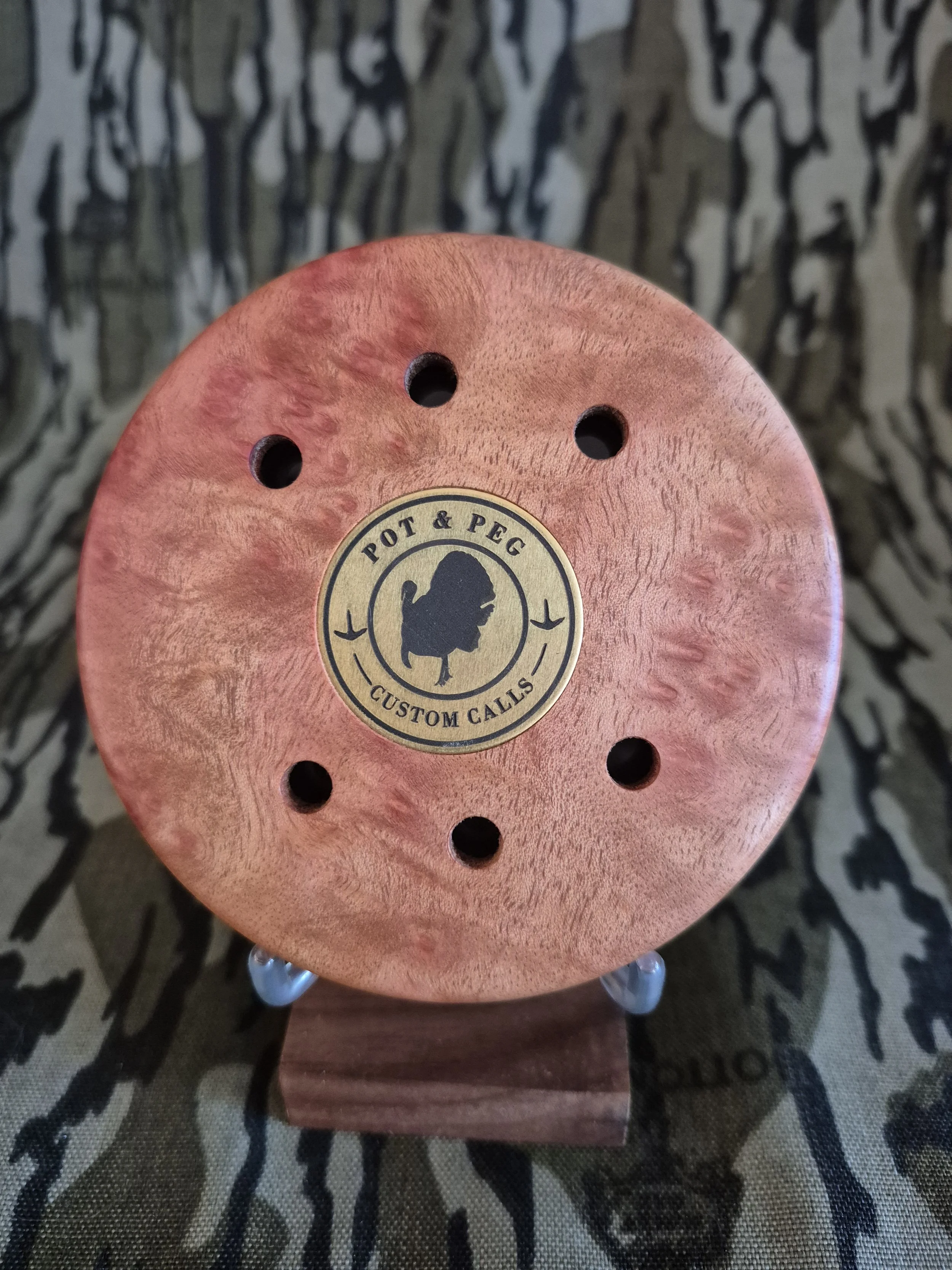 Crafted from stunning Camphor Burl, this pot call combines beauty with performance. The aluminum playing surface over a crystal soundboard produces sharp, cutting yelps and crisp, high-pitched tones that carry through the woods, while still offering the soft clucks and purrs needed to finish a bird.